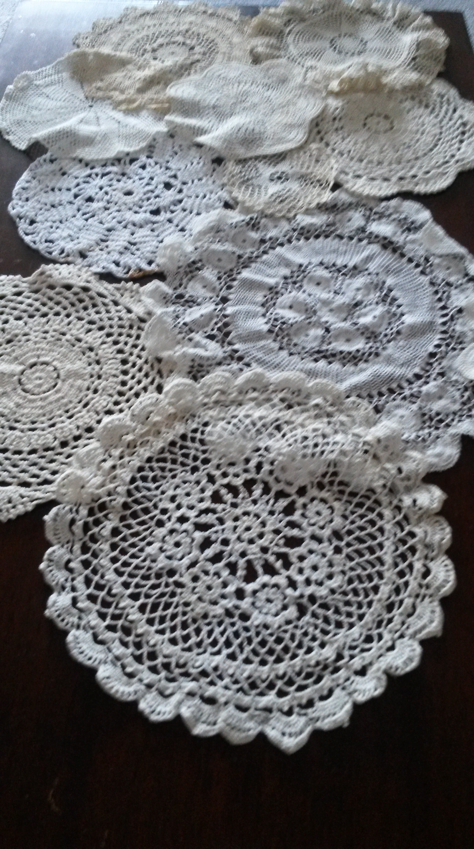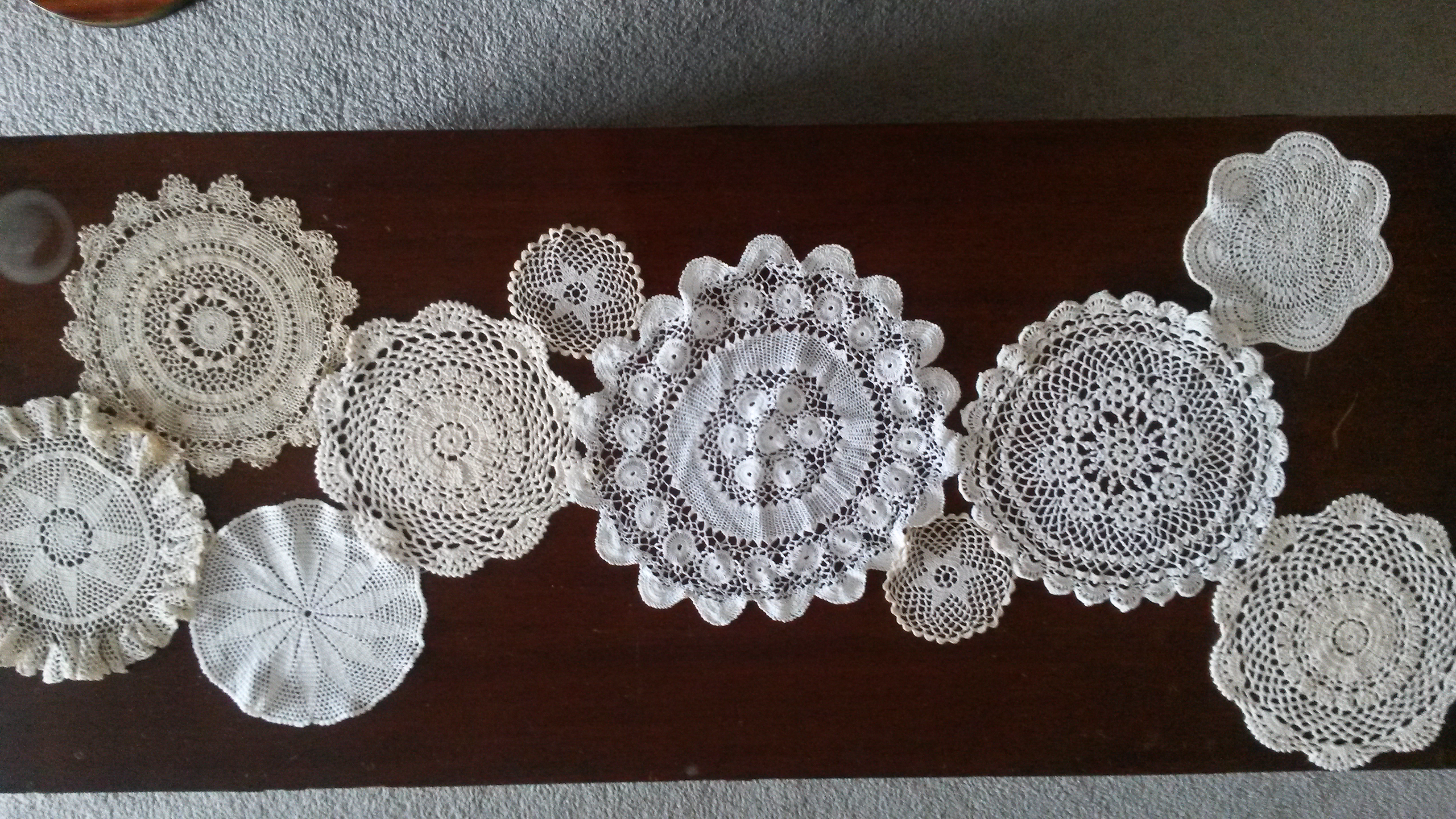 So, out came the doillies, and my needle and thread. Here are the doilies I chose to use: they are all roughly in the same colour palette, and I like that they vary a little bit in size.