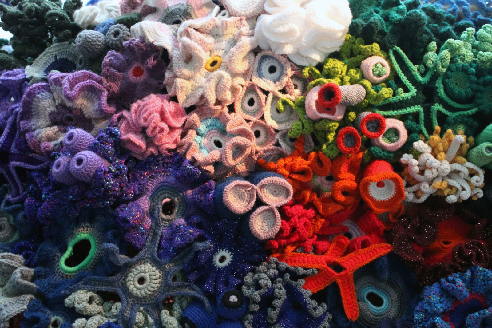 This idea was picked up by two Australian sisters, Christine and Margaret Wertheim. Margaret is a physicist, and Christine is an artist. As much as wool and water don’t normally mix well (think about the feeling of wet wool socks, and you’ll know what I mean) they realised that crocheting replicas of coral reefs actually made a lot of sense. The way that a coral grows and develops is in a hyperbolic plane. That frilled, crenulated doughnut shape is nature’s way of expressing hyperbolic geometry: good one, Mother Nature. And Dr.Taimina proved that crochet worked really well to express hyperbolic geometry too. So in 2005,  the Wertheim sisters developed an amazing project through the Institute for Figuring in Los Angeles: the Hyperbolic Crochet Coral Reef.