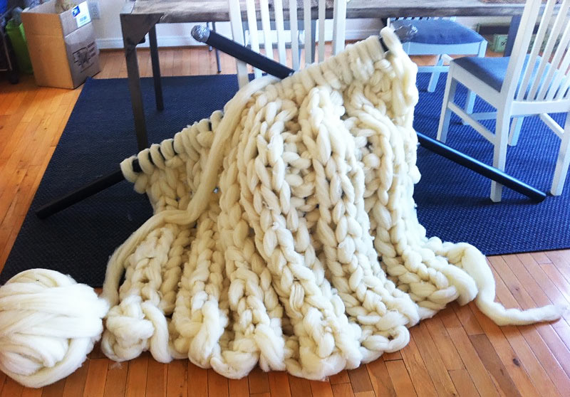 A growing trend in the world of knitting is large-scale projects. Giant needles, arm- and hand-knitting, and enormous yarn results in gargantuan examples of knitted objects. This process often focuses on the texture of the material, because the individual stitches are so large. It also shows off the construction of the knitting piece itself. Knitting, by the way, is a series of inter-twined loops made from a single yarn or strand.