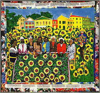 A quilt called Quilting Bee at Arles shows a group of figures standing around a finished quilt, which features a sunflower motif, while actual sunflowers grow behind them. A lone figures stands apart from the group. The quilting group is made up of black women of different ages. Their voices can be heard in the written narrative that circles the quilt. Ringgold writes out the words the speak on the border of the quilt. These words give us information about what is going on in this image. The women assert that through their quilting work, they are going to make the world run right again. These women are named: among them stand, left to right, Madam Walker, Sojourner Truth, Ida Wells, Fannie Lou Hammer, Harriet Tubman, Rosa Parks, Mary McLeod Bethune, and Ella Baker. They are joined by a character developed by Ringgold, Willia Marie Simone, who some have argued stands for Ringgold herself. The combination of the sunflowers and the title, which tells us that this is taking place at Arles, gives us clues about who the lone figure might be. He is Vincent van Gogh, well-known Dutch painter, whose still-lifes of sunflowers are among his most acclaimed works. I think this work is Ringgold’s clever and subtle way of suggesting that perhaps it is time for women of colour to be the focus of art and art production: white men have had plenty of time in the spotlight. It is also possible that she means to indicate that the work of women of colour has the power to make positive changes in the world.It also positions women of colour and textile artists as equal to more well-known male artists, like van Gogh. On it’s surface, it’s a bright and cheerful quilt about quilting. Look harder, though, and this quilt seems to demand that we pay more attention to artists of colour, and the stories they want to tell.